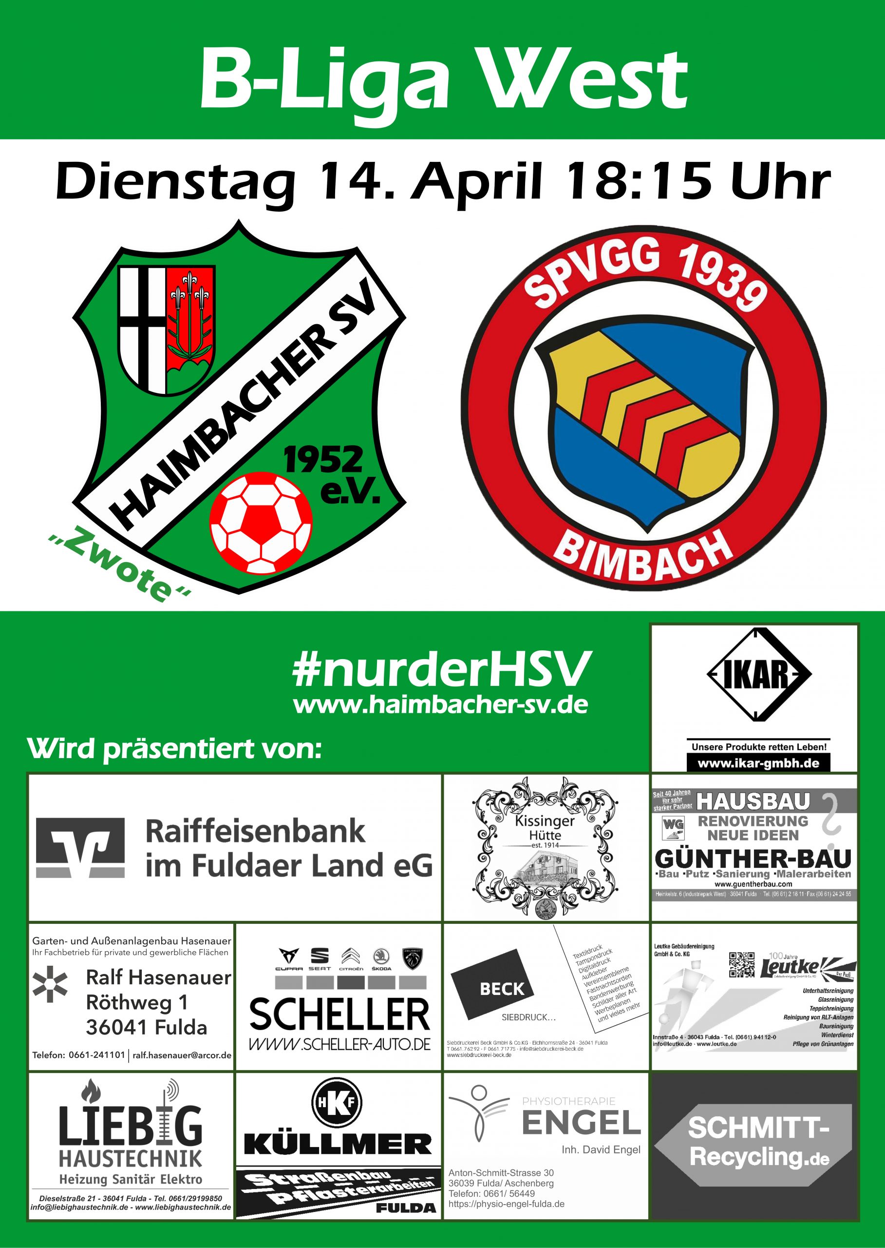 Heimspiel am Dienstag 11. April 2026 Am Dienstag, den 14. April, steht für unsere zweite Mannschaft das nächste Heimspiel in der B-Liga West an. Anstoß ist um 18:15 Uhr auf heimischem Platz. Zu Gast ist die zweite Mannschaft der Spvgg. Bimbach.