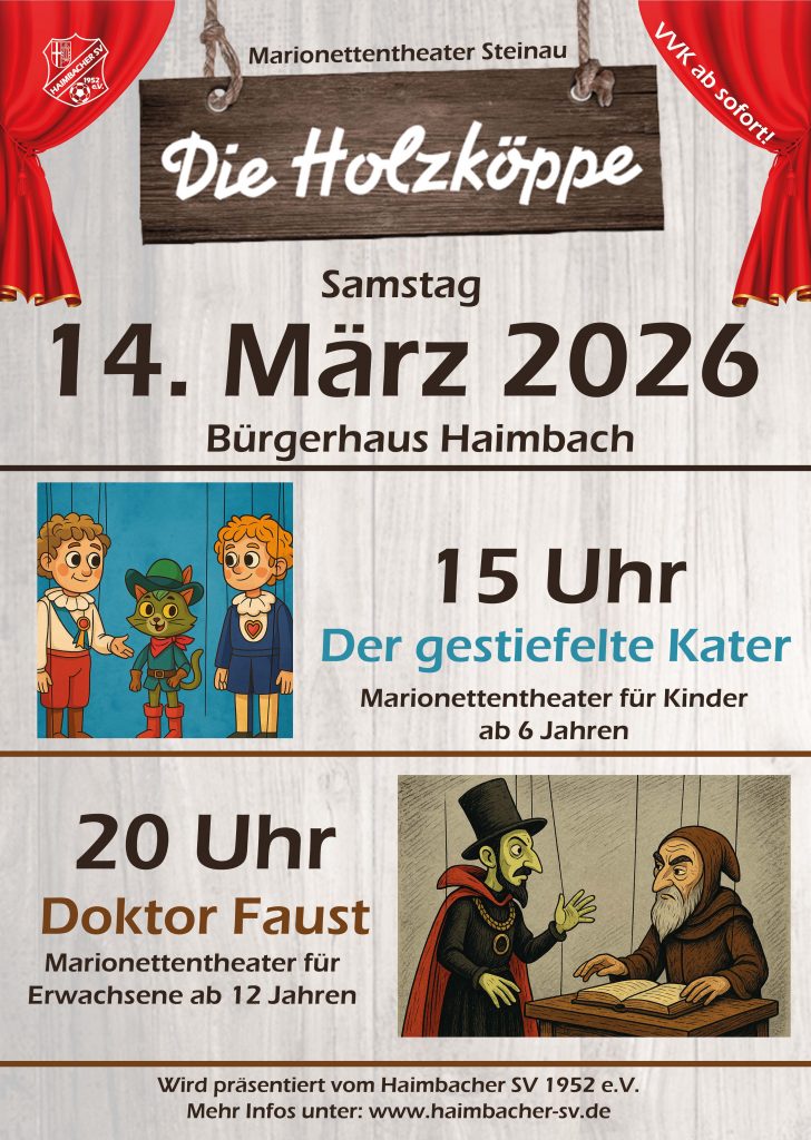 Das traditionsreiche Steinauer Marionettentheater „Die Holzköppe“ gastiert am 14. März 2026 im Bürgerhaus Haimbach. Seit Generationen begeistert die Familie Magersuppe ihr Publikum mit klassischem Marionettenspiel nach den Märchen der Brüder Grimm. Die „Holzköppe“ bringen echtes Theaterhandwerk, liebevoll gestaltete Figuren und den Zauber vergangener Zeiten auf die Bühne.